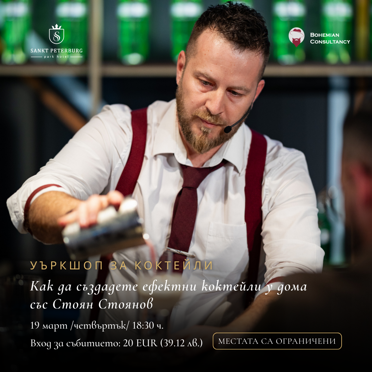 Заповядайте на практически уъркшоп със Стоян Стоянов от Bohemian Consultancy, за да научите как да създавате в домашни условия коктейли, които впечатляват. Не е необходим предишен опит - само любопитство и желание да експериментирате.